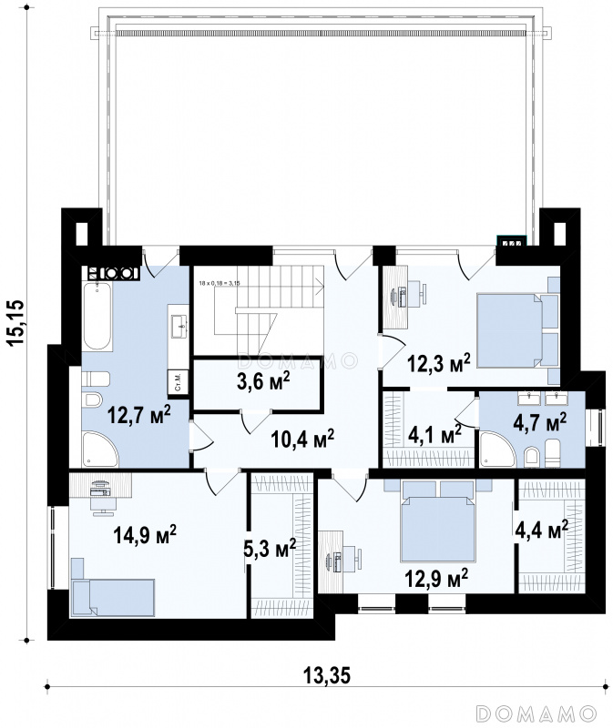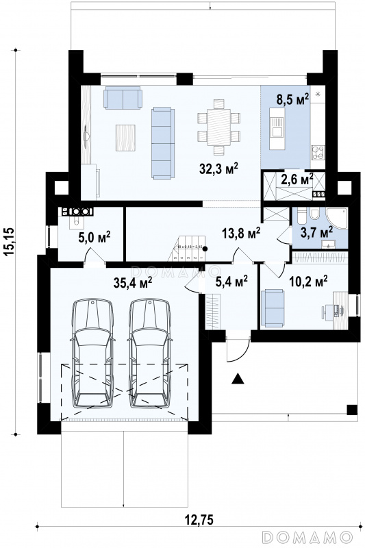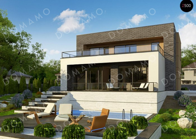 Проект современного двухэтажного дома из газобетона с плоской крышей, с четырьмя комнатами, гаражом и террасами на двух уровнях